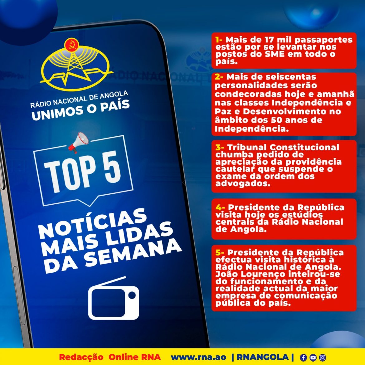https://rna.ao/rna.ao/2025/09/08/mais-de-17-mil-passaportes-estao-por-se-levantar-nos-postos-do-sme-em-todo-o-pais/ https://rna.ao/rna.ao/2025/09/09/mais-de-seiscentas-personalidades-serao-condecoradas-hoje-e-amanha-nas-classes-independencia-e-paz-e-desenvolvimento-no-ambito-dos-50-anos-de-independencia/ https://rna.ao/rna.ao/2025/09/12/191767/ https://rna.ao/rna.ao/2025/09/12/presidente-da-republica-visita-hoje-os-estudios-centrais-da-radio-nacional-de-angola/ https://rna.ao/rna.ao/2025/09/12/presidente-da-republica-efectua-visita-historica-a-radio-nacional-de-angola-joao-lourenco-inteirou-se-do-funcionamento-e-da-realidade-actual-da-maior-empresa-de-comunicacao-publica-do-pais/